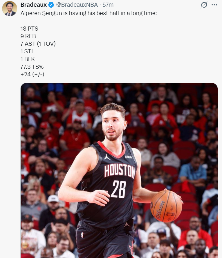 此役阿尔佩伦-申京表现非常出色,首节9分钟里他就已经3中3拿到6分4篮板4助攻,次节9分钟里更是6中3+三分1中1拿到12分5篮板3助攻,半场18分9篮板7助攻1抢断1盖帽1失误,真实命中率77.3%,正负值+24。国王的内线群根本无法限制他分毫。